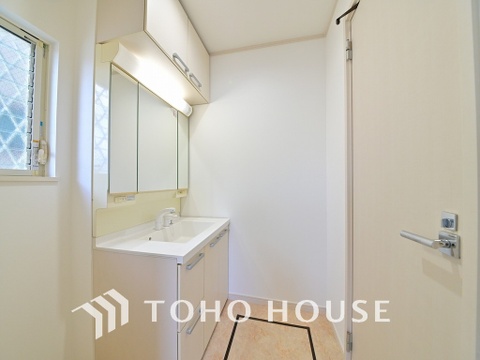 洗面台には三面鏡を採用。身だしなみを整えやすく収納量も良好です