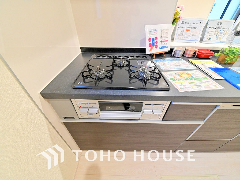 3口ガスコンロでお料理のスピードもUP。効率よくお料理できますね