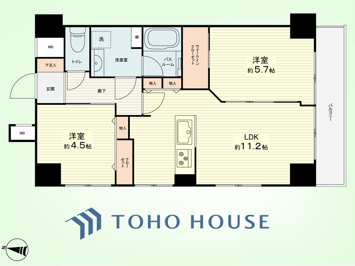 2LDK 専有面積51.41平米、バルコニー面積5.4平米
